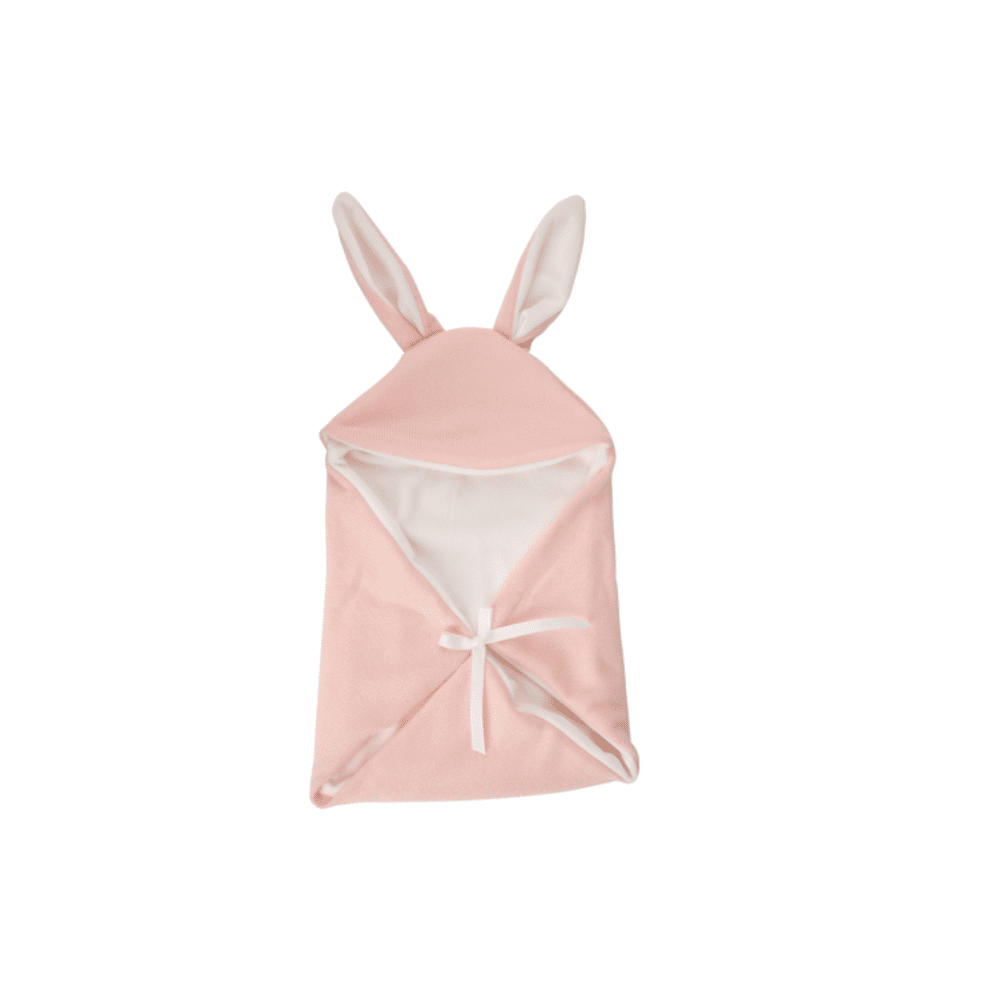- Met een fopspeen en zacht slaapzakje met konijnenoren