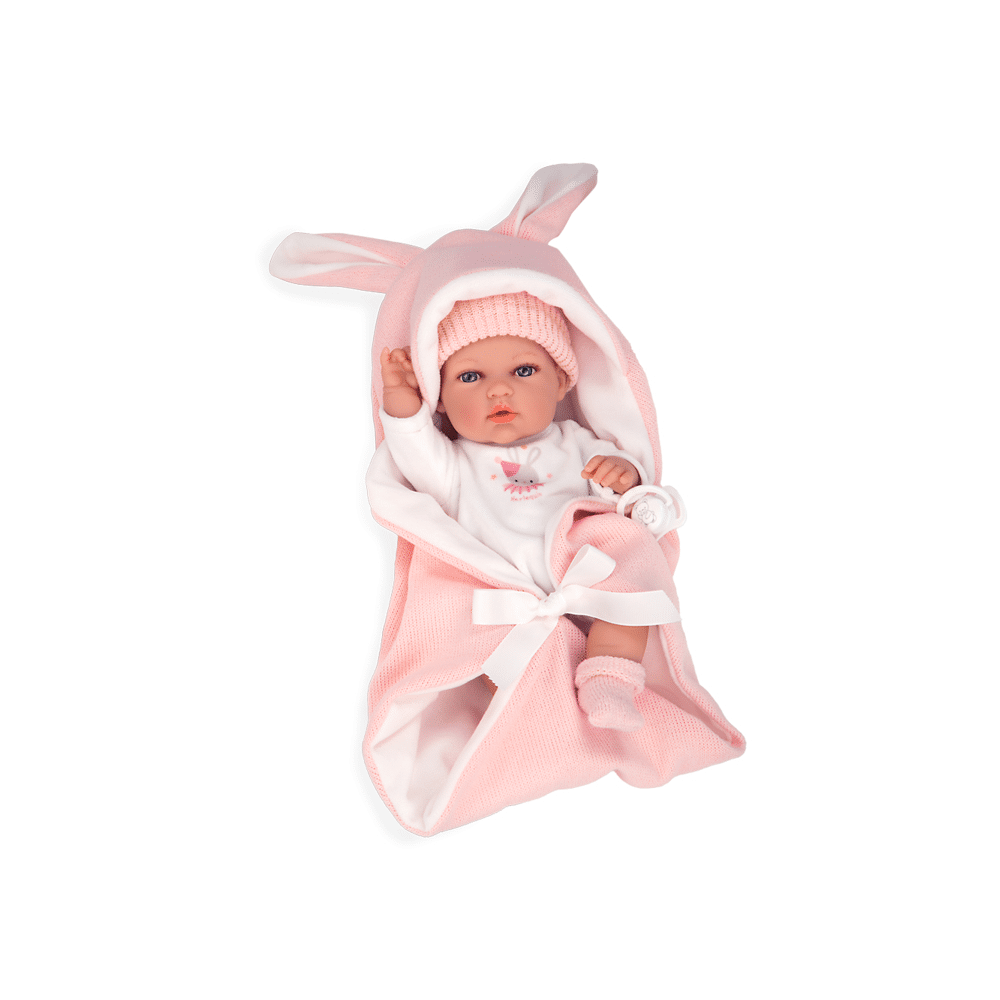De Arias Pop Natal Rosa is een schattig en speels popje van 30 cm, perfect voor jonge kinderen. Het popje komt met een roze mutsje, een pyjama met een schattige konijntekening, een fopspeen en een slaapzakje met konijnenoren, waardoor het een ideaal speelgoed is voor urenlang verzorgend spel.