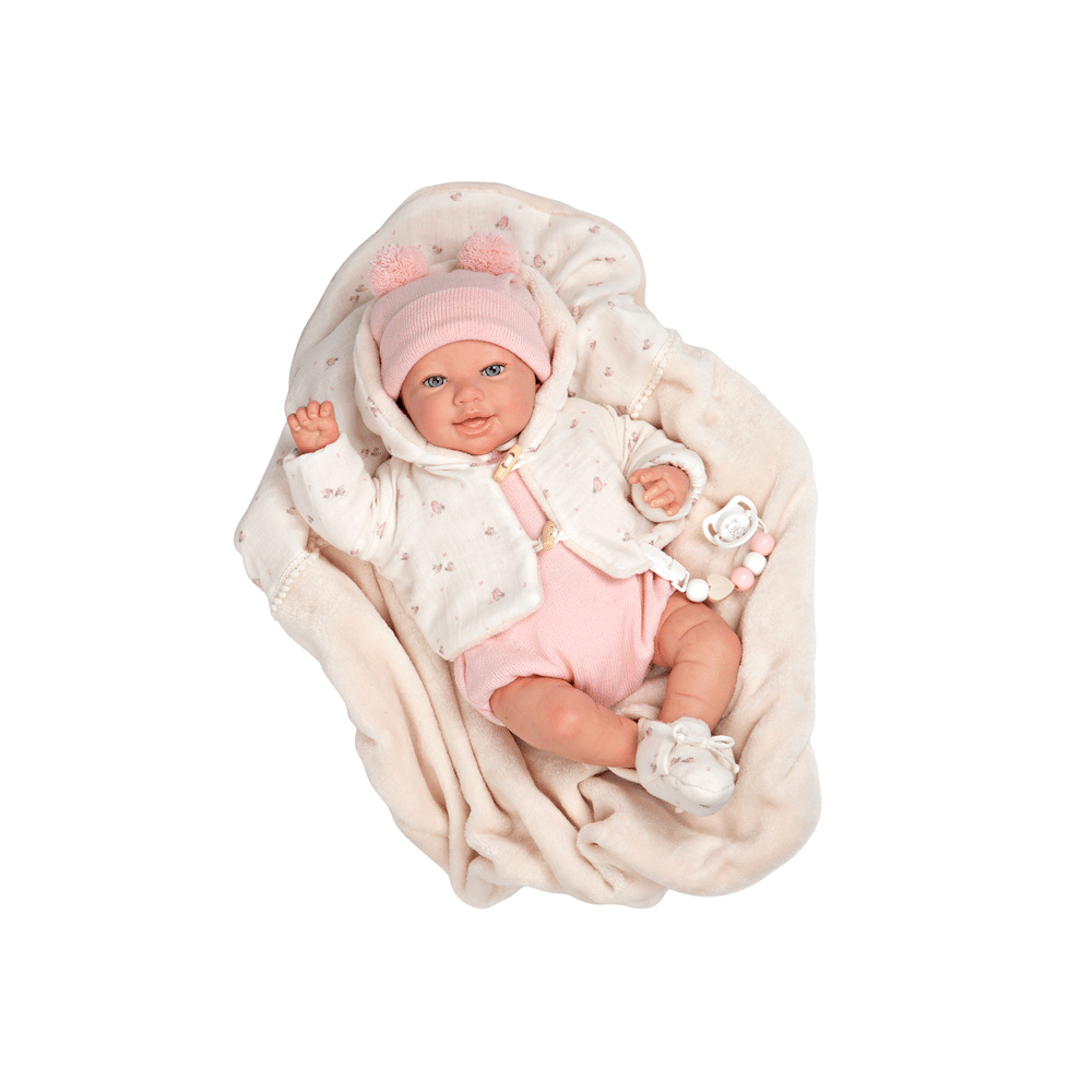 Elba draagt een poederroze wolletjes outfit met een stijlvolle crèmekleurige jas met patroontje. Alles is tot in de puntjes verzorgd. Haar accessoires maken het helemaal af — klaar voor uren speelplezier!Samengevat: een droom van een reborn pop