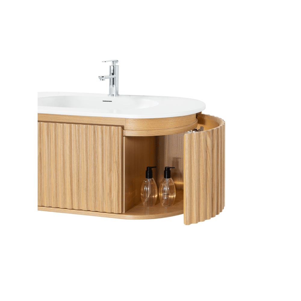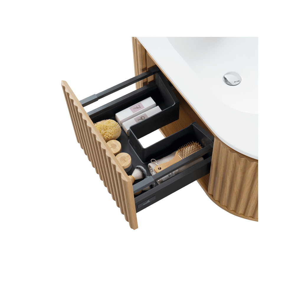 De Begonia wastafelonderkast in naturel eiken combineert natuurlijke warmte met praktische functionaliteit. Jij geniet van een greeploze, strakke afwerking en een soft close lade die zacht en geruisloos sluit. De ruime lade biedt voldoende opbergruimte voor al je badkamerbenodigdheden en houdt alles netjes georganiseerd.