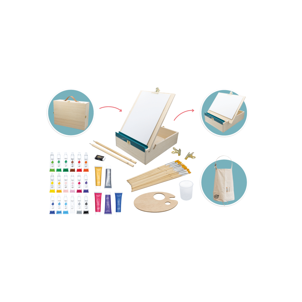 De houten koffer bevat hoogwaardige materialen voor jonge artiesten vanaf 7 jaar. Alles is netjes opgeborgen, zodat creativiteit altijd binnen handbereik is.- Inclusief diverse verfsoorten, penselen en kleurpotloden