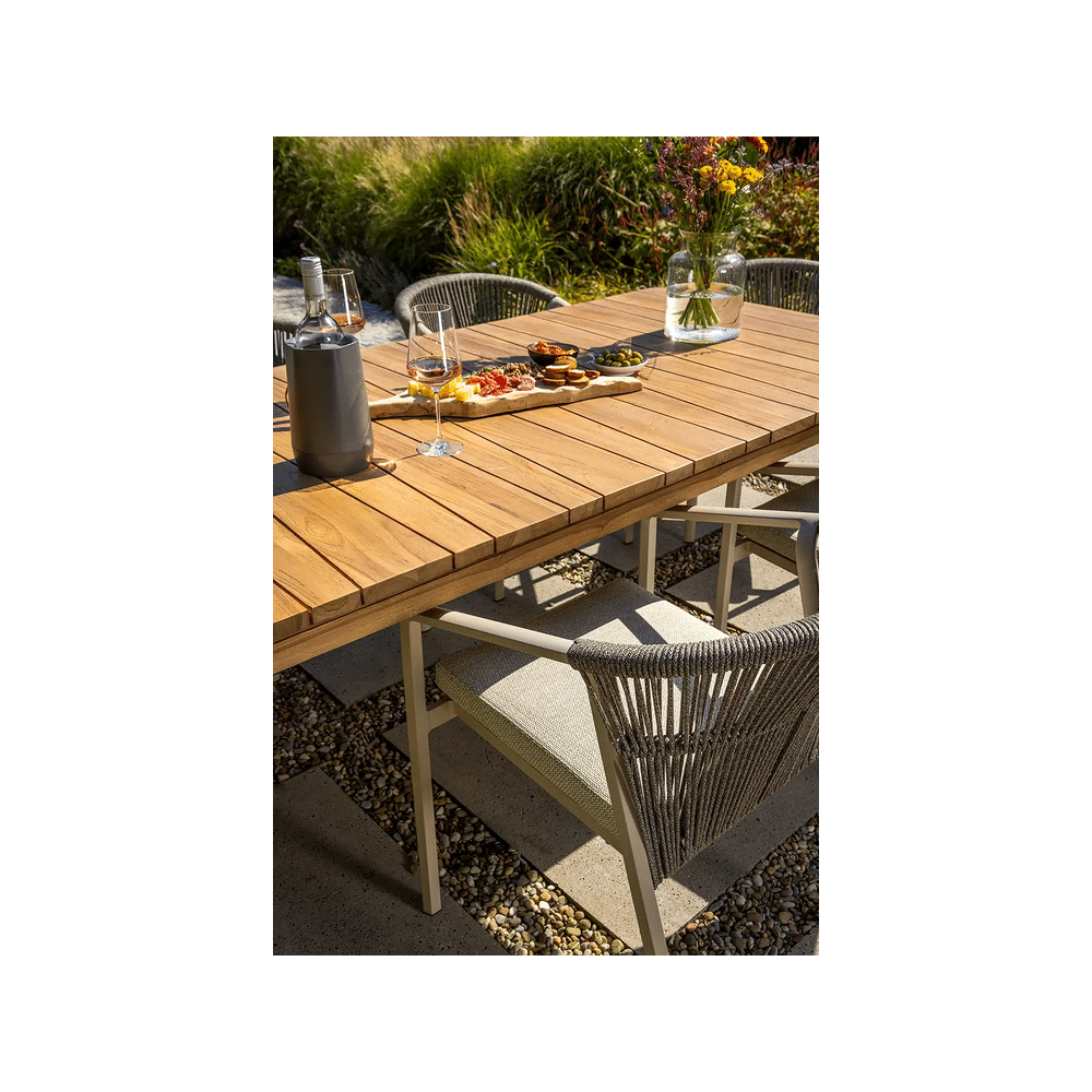 De Callisto Nusa Eettafel 240x110xH75cm Teak Natural combineert robuustheid met een natuurlijke uitstraling. Perfect voor gezellige diners met familie en vrienden, zowel binnen als op overdekte terrassen.