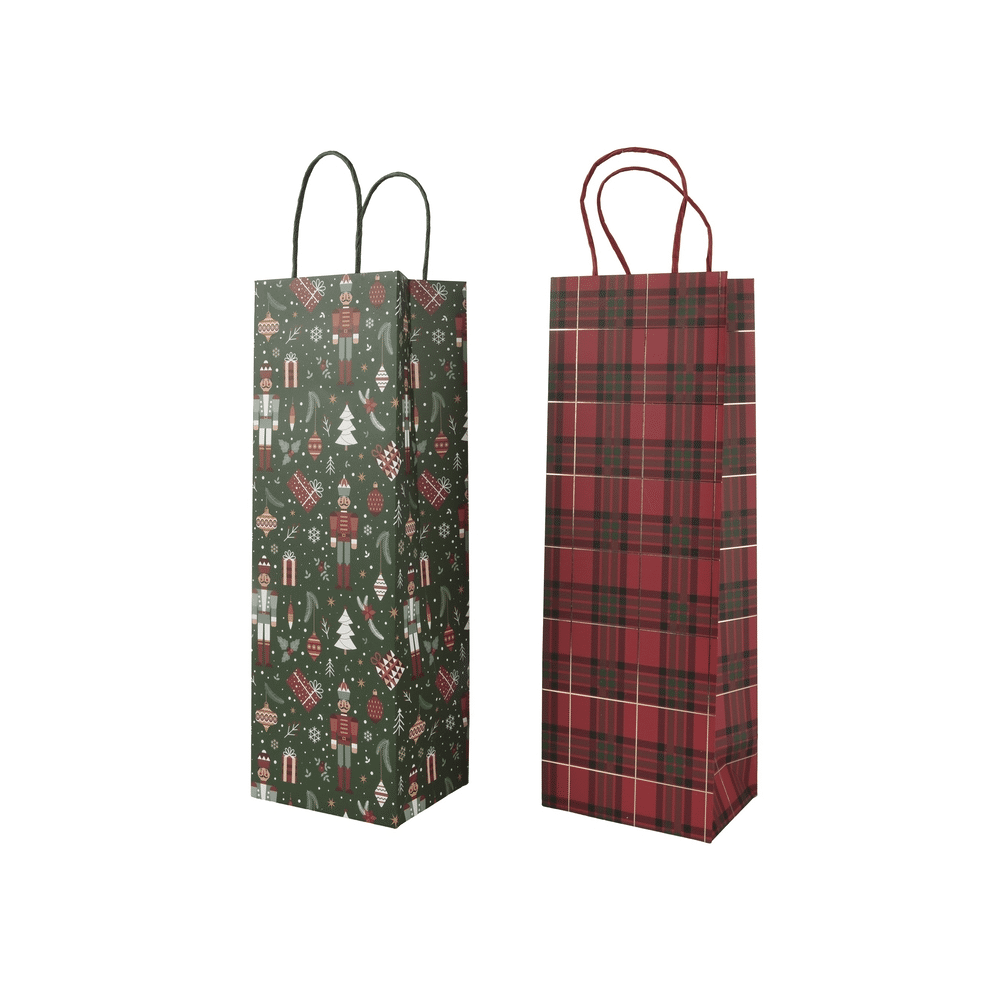Breng instant kerstsfeer onder de boom met de kerstcadeauzakken voor flessen. Deze papieren shoppers met vrolijke print maken van elke wijnfles een écht geschenk. Perfect om je cadeautjes snel, netjes én feestelijk te verpakken!De ideale kerstverpakking