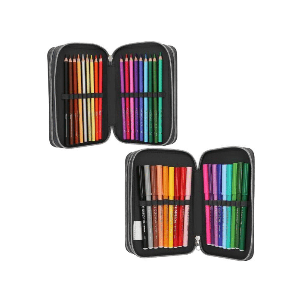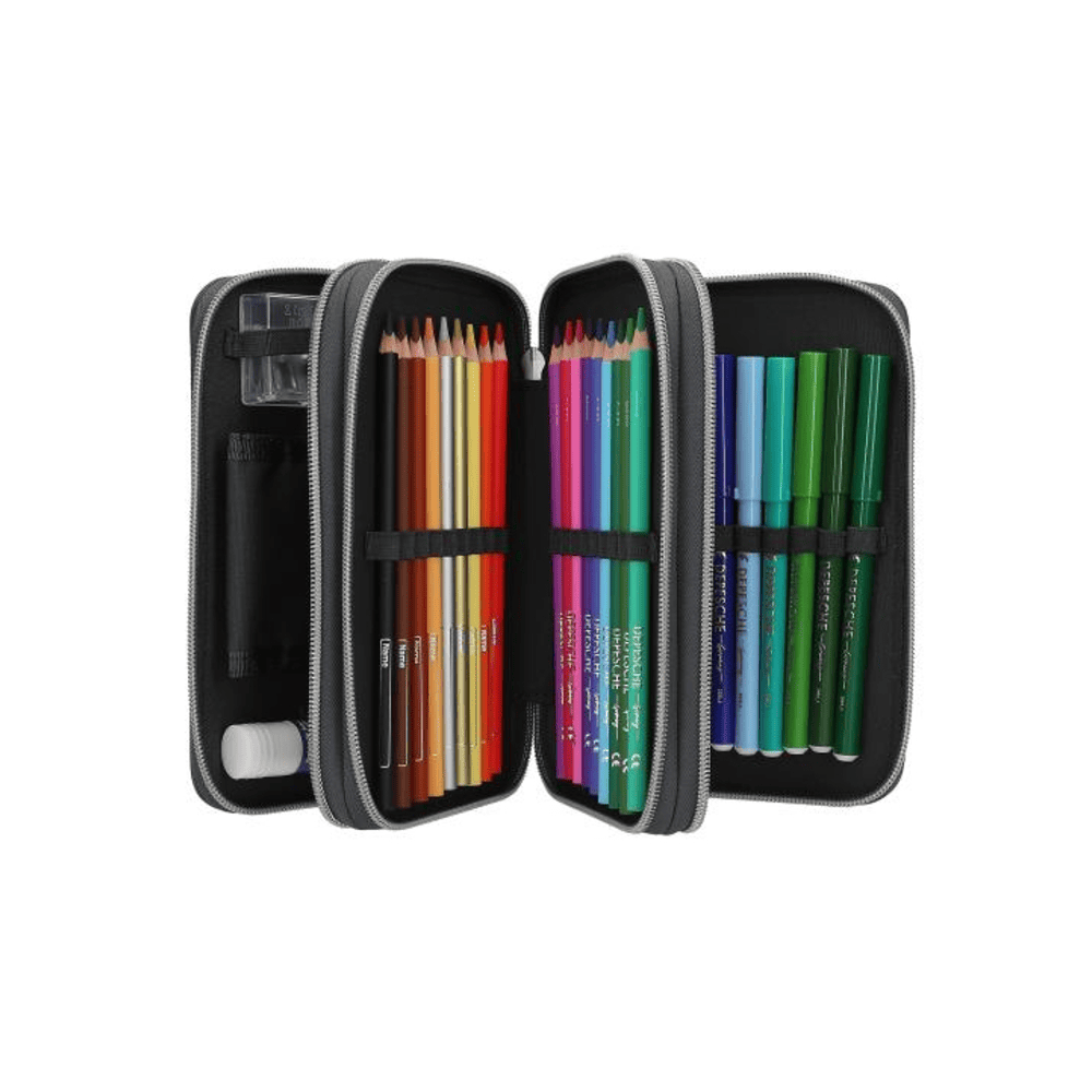 De etui is volledig uitgerust met meer dan 40 schoolbenodigdheden zoals kleurpotloden, stiften, potloden en accessoires. Dankzij de drie aparte vakken blijft alles netjes georganiseerd.