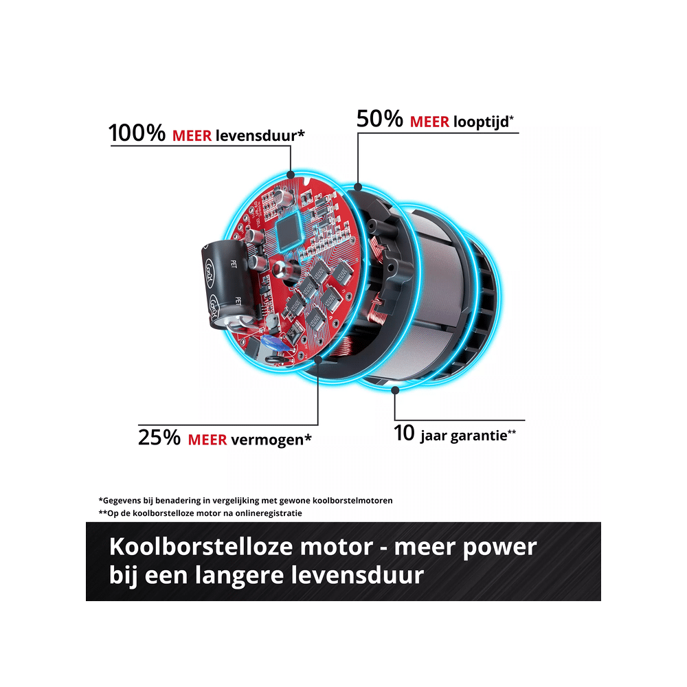 - Brushless motor met 10 jaar garantie na online registratie