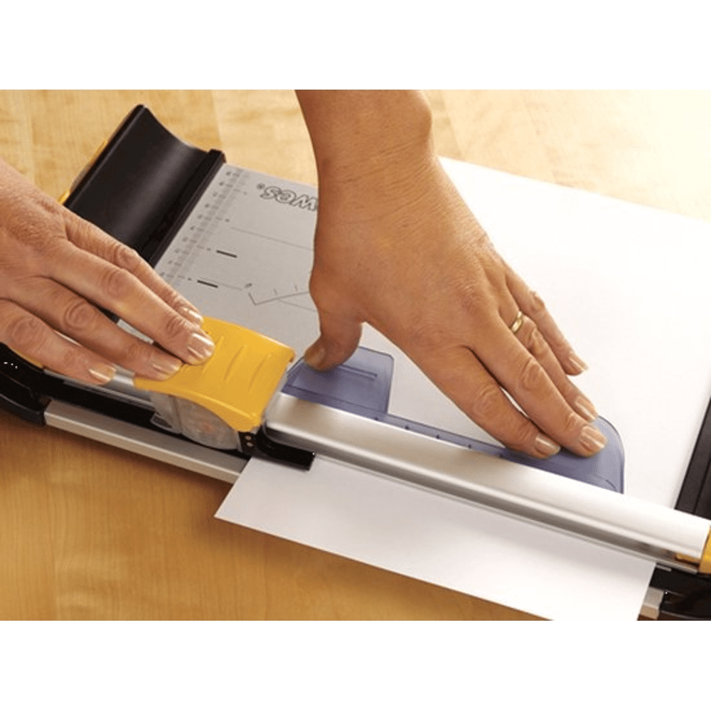 Je legt je blad op de gids, schuift het mes en klaar.De antislipvoet houdt alles netjes op zijn plaats, zelfs op gladde bureaus.