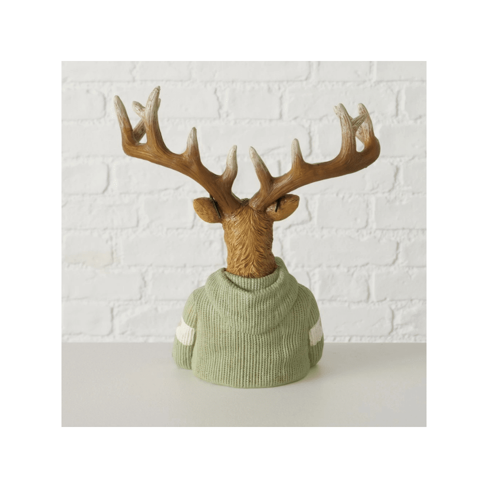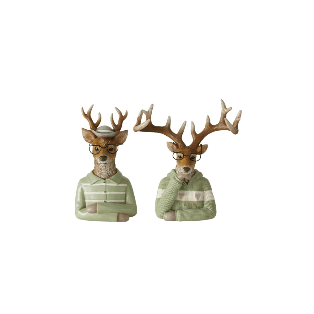Charmant rendierbeeld van 25 cm hoog, gemaakt uit polyresin en verkrijgbaar in twee kleurvarianten: beige-bruin of lichtgroen. Een sfeervolle toevoeging aan je winter- of kerstdecoratie. Prijs per stuk.