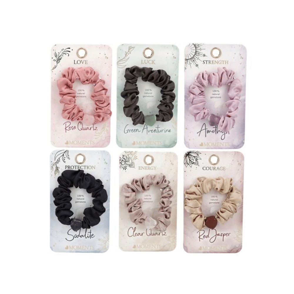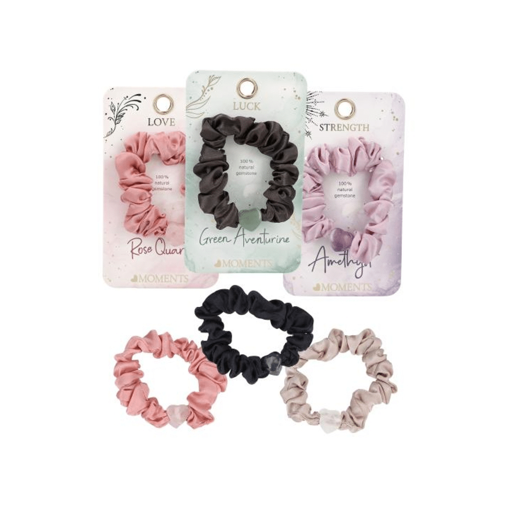 Geef je look een subtiele én stijlvolle touch met deze Heart Moments scrunchie. De scrunchie is gemaakt van 100% zijde en bevat een hartvormige edelsteen — zo kan je haaraccessoire ook dienst doen als armband. Elke edelsteen is natuurlijk en wordt verondersteld energie of positieve vibes uit te stralen, zoals rust, geluk, kracht of harmonie. Een speels en symbolisch accent dat bij veel outfits past. Let op: je ontvangt altijd 1 scrunchie uit het assortiment.