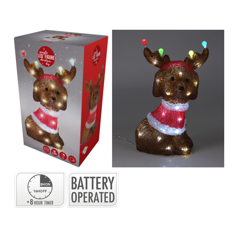 Op zoek naar een vrolijk kerstfiguur dat meteen sfeer brengt? Deze kersthond met LED-verlichting is hét knusse lichtpuntje in jouw kerstdecor. Gemaakt van stevig acryl en voorzien van 30 warme LED-lichtjes. Zet 'm voor je raam, bij de boom of zelfs buiten op je stoep – hij straalt overal!Voor binnen én buiten