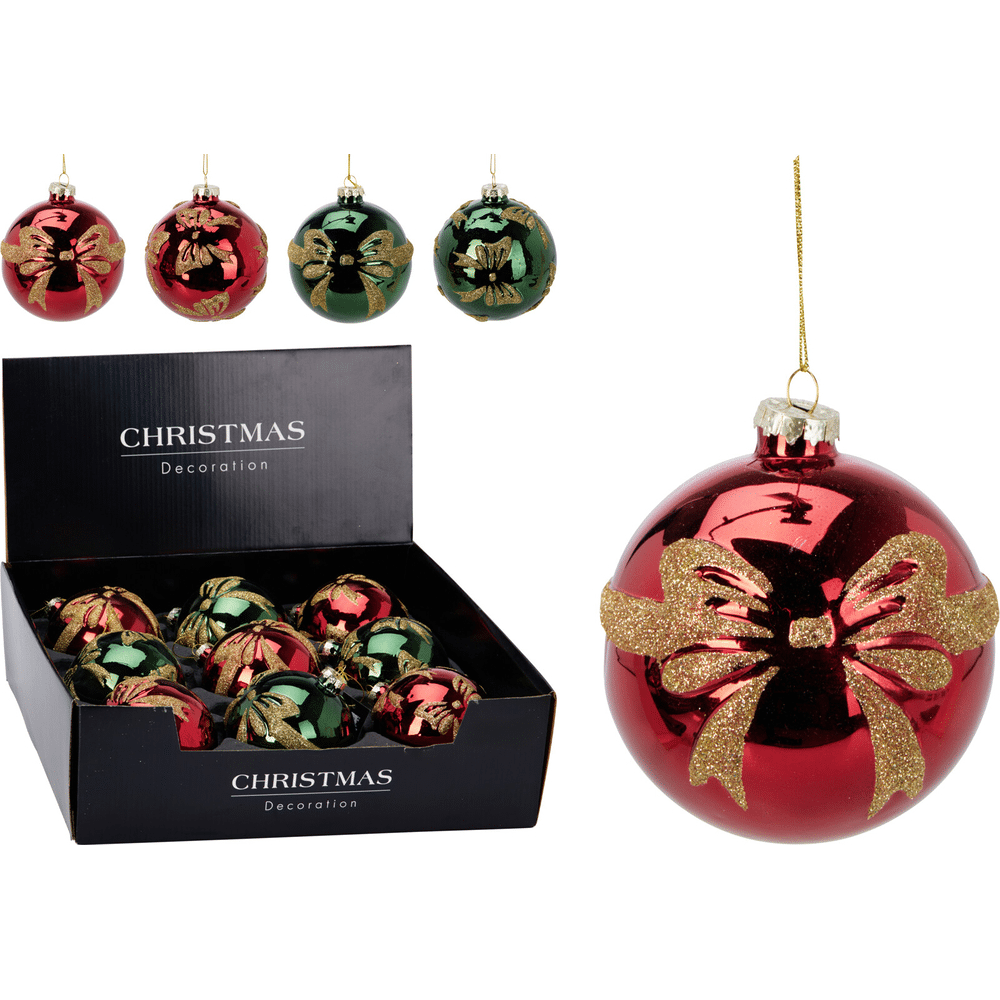 Deze glazen kerstbal van 100 mm met strikdetail is verkrijgbaar in vier varianten. Perfect om een elegante en feestelijke touch aan je boom te geven.