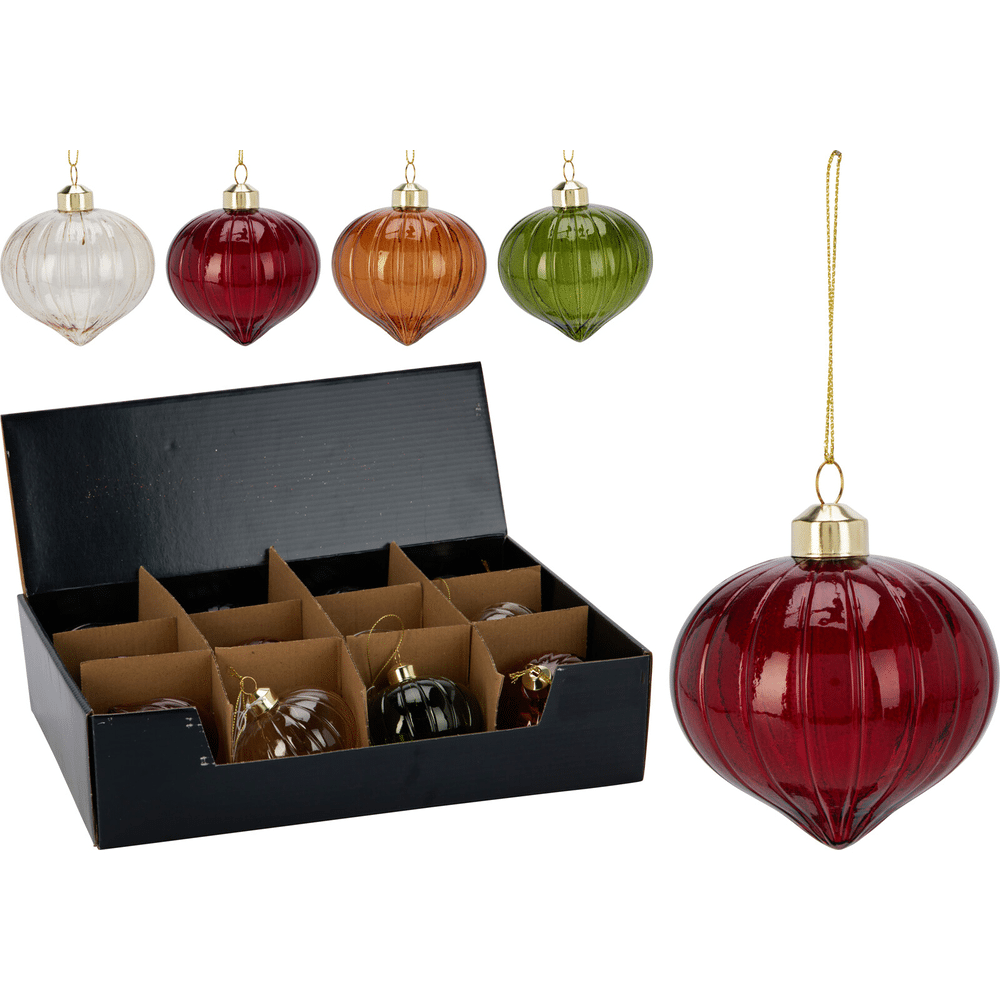 Deze glazen kerstballen in ui-vorm van 8 cm zijn verkrijgbaar in vier varianten en geven je boom een speels en elegant accent.