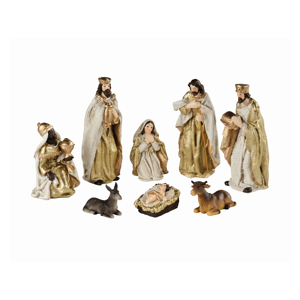 Kerststal figuren Polyresin 8stuks Creme/goud