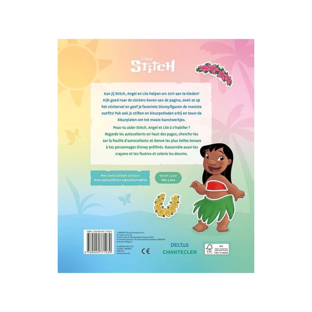 Hou jij van kleuren en plakken? Met dit vrolijke kleur- en stickerboek ga je aan de slag met Stitch, Angel en Lilo. Je geeft hen de leukste outfits en maakt elke pagina uniek. Ideaal voor uren creatief speelplezier thuis of onderweg.