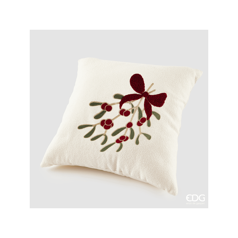 Een zacht, vierkant kussen met mistletoe-print, perfect voor een kerstige touch in de woonkamer of slaapkamer. Het witte kussen past bij diverse interieurstijlen.
