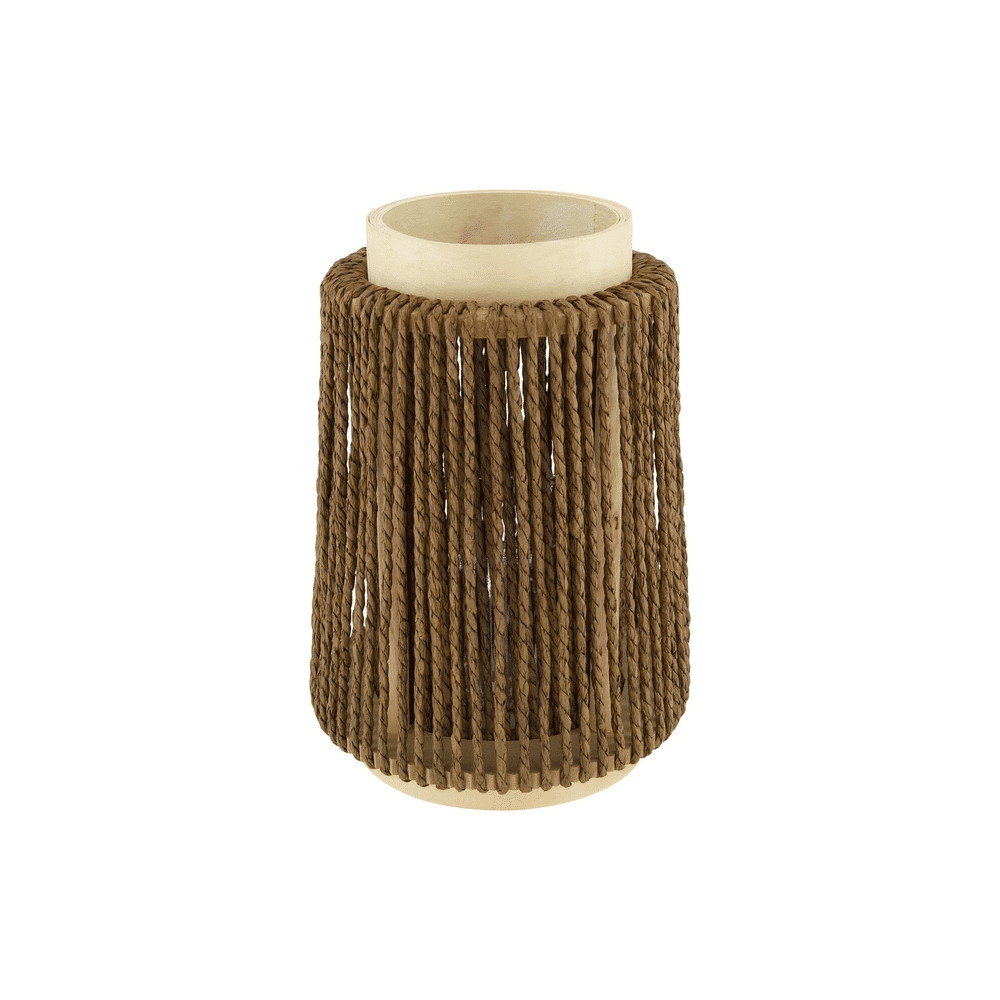 Deze stijlvolle lantaarn is gemaakt van gevlochten papierkoord met een glazen inzet, waardoor het kaarslicht zacht wordt verspreid. De natuurlijke bruine kleur geeft een warme en gezellige uitstraling, ideaal voor binnen of op overdekte buitenruimtes.
