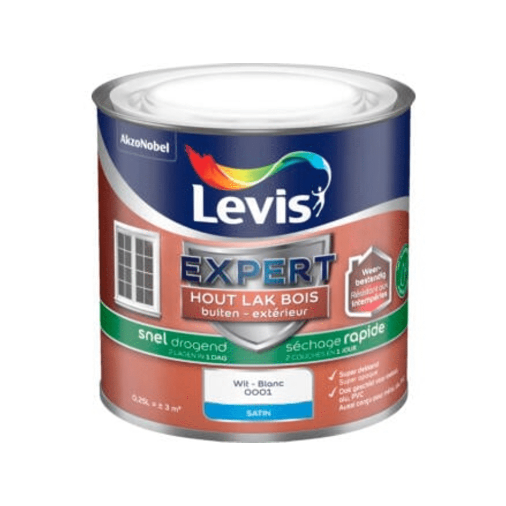 - Product: Levis Expert Houtlak Buiten Satin Sneldrogend Wit 0,25l