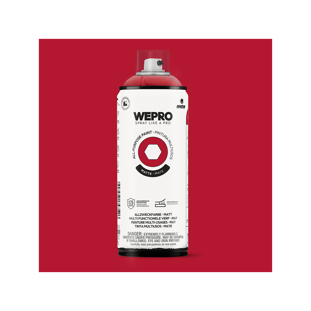 Maak kennis met de Mtn Wepro Solvent Tango Red 400ml spuitbus voor intense dekking en een dynamische tango rode satin finish op muren, hout en metaal.