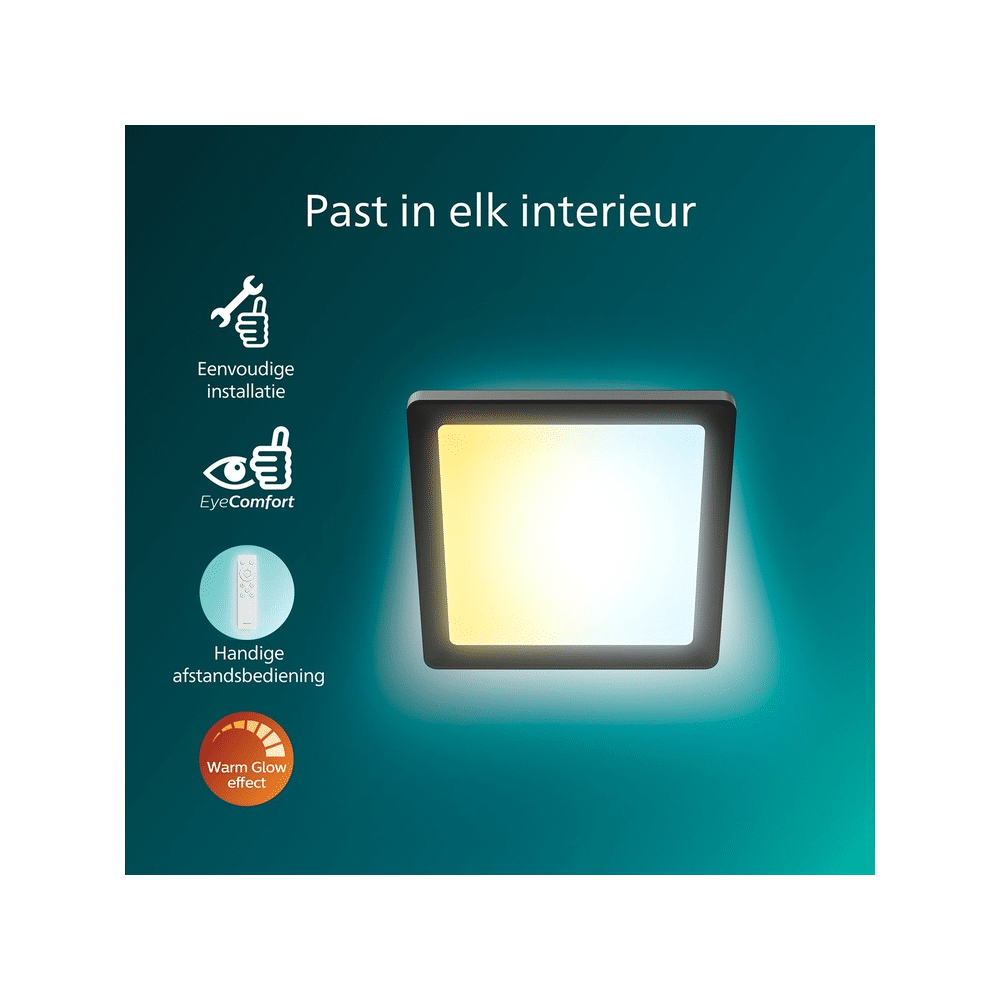 - Product: Philips Valen Plafondlamp Afstandsbediening Vierkant Zwart 17w 22-27-40-65k Warm Glow