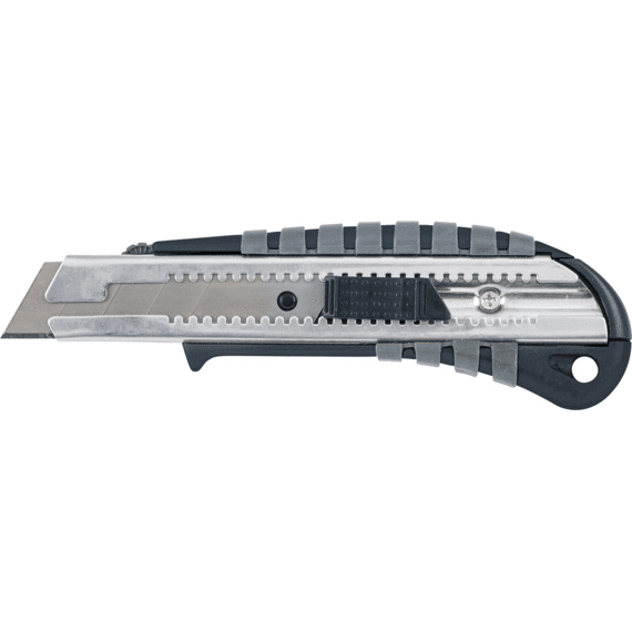 Met 1 stuk afbreekmesje 25 mm, lemmetgeleiding van robuust roestvrij staal, eenvoudig verwijderen van het gebruikte mesje via de afsluitkap achteraan, lemmetbreker aan de afsluitkap, met autolockfunctie en vastzetwieltje: automatisch vergrendelen en aanvullende bescherming voor veilig werken, optimaal gebruiksgewicht, zwaar heft van spuitgietzink met rubberen antisliphandvat.