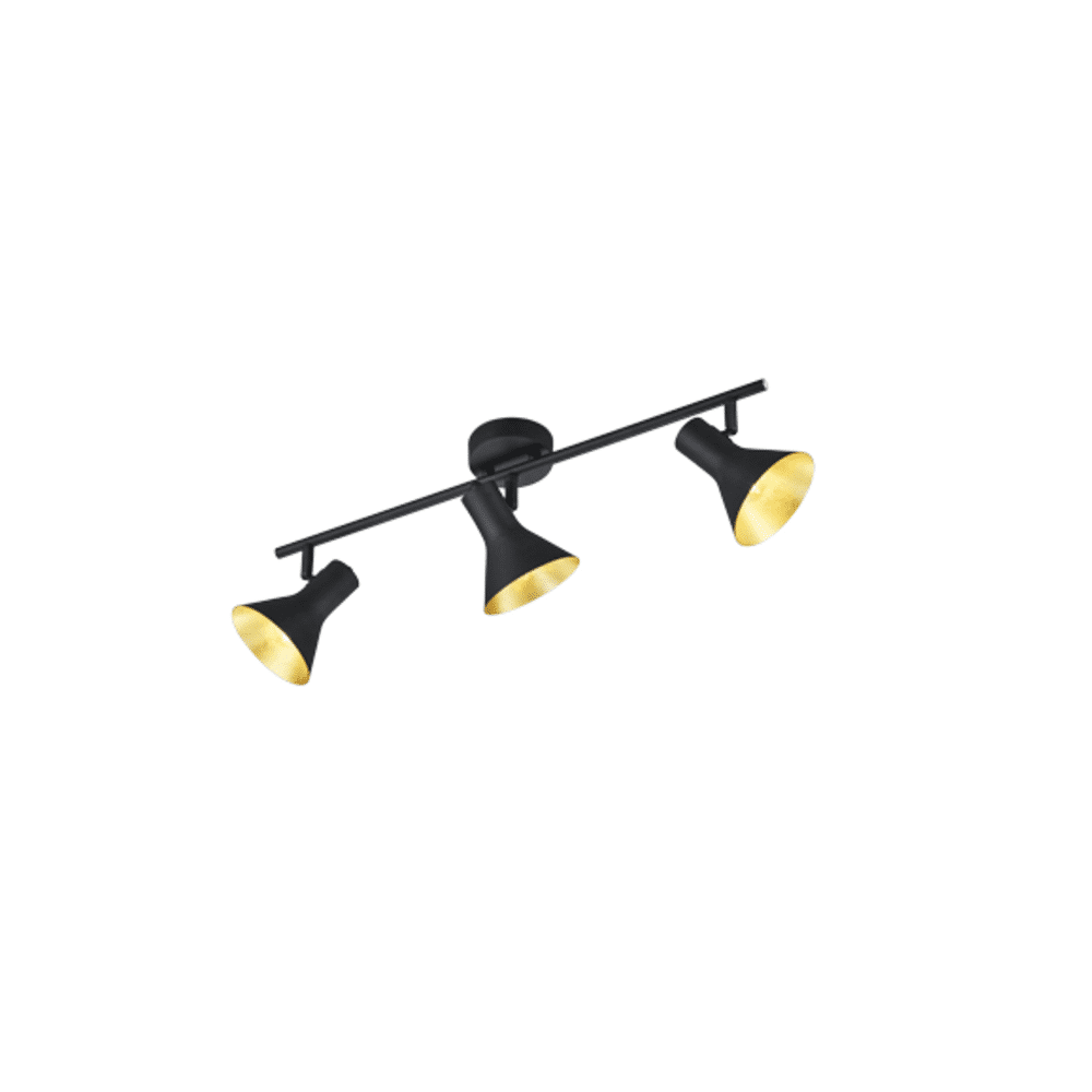 De Trio NINA drielichts spot brengt een trendy vintage uitstraling in je woonkamer, slaapkamer of hal. Met de drie draaibare koppen kun je het licht precies richten, ideaal voor sfeerverlichting of om meubels en accessoires subtiel uit te lichten. De lamp is 58 cm breed, 21 cm hoog en 11 cm diep, uitgevoerd in mat zwart met een chique gouden binnenkant. Werkt met E14 LED-lichtbronnen (excl. 40W) voor energiezuinig en duurzaam gebruik.