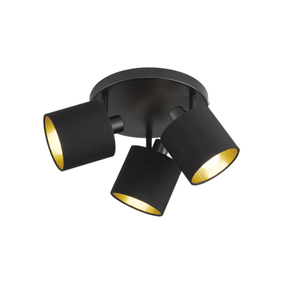 De Trio TOMMY 3-lichts spot zorgt voor een gezellige sfeer in elke ruimte. De textiele kappen verhogen de comfortfactor en creëren een warme, knusse uitstraling. Het mat zwarte metalen frame en de zwart-gouden stoffen kappen voegen een moderne en stijlvolle touch toe aan je interieur. De drie draaibare koppen met een diameter van 25 cm kunnen gericht worden om specifieke zones te accentueren, waardoor deze spot ideaal is voor kleine woonruimtes. Werkt met E14 LED-lichtbronnen (excl. 28W) voor energiezuinig en duurzaam gebruik.