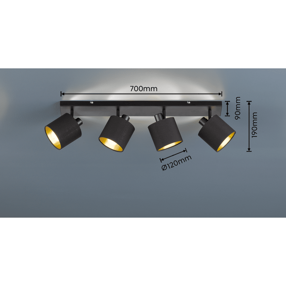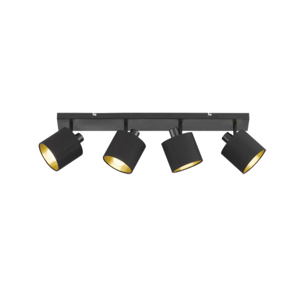 De Trio TOMMY 4-lichts spot biedt een perfecte balans tussen gezelligheid en modern design. De textiele kappen zorgen voor een warme en knusse sfeer, terwijl het mat zwarte metalen frame en de zwart-gouden stoffen kappen een stijlvolle en eigentijdse uitstraling geven. De vier draaibare koppen met een breedte van 70 cm kunnen gericht worden om specifieke zones in je woning of gang te accentueren. Werkt met E14 LED-lichtbronnen (excl. 28W) voor energiezuinig en duurzaam gebruik.