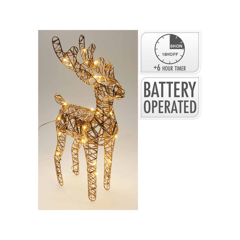 Deze champagnekleurige rendier van 34 cm is voorzien van LED-verlichting, waardoor hij een warm en feestelijk licht verspreidt. Perfect voor kerstdecoratie binnen.
