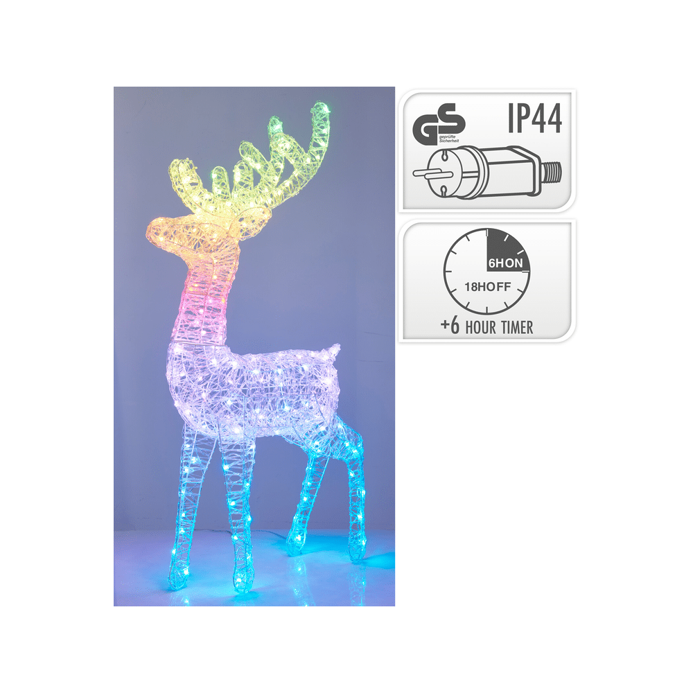 Dit rendier is niet zomaar kerstdecoratie. Het is een sfeermaker, een blikvanger, een instant-feelgood element. Met zijn transparant frame en meerkleurige LED-verlichting steel je zonder moeite de show in je straat.- 165 kleurrijke LED-lichtjes