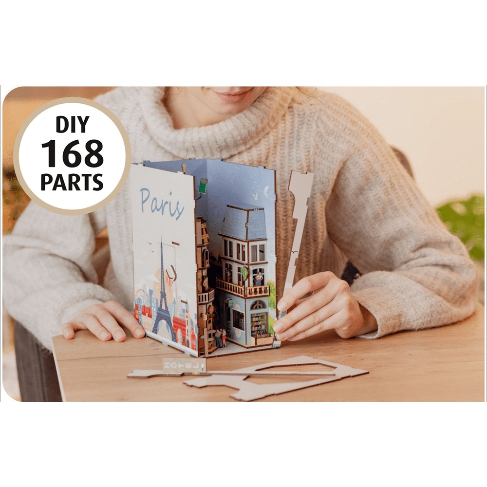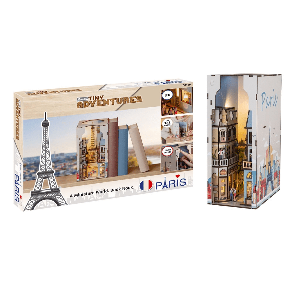 Beleef het charmante Parijs op een unieke manier! De Revell Tiny Adventures Book Nook Paris brengt jouw boekenplank tot leven met een betoverend miniatuurstadje.