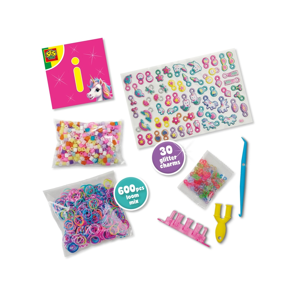 Duik in een wereld vol kleur, glitter en eenhoorns! Met deze Unicorn Loom Set van SES Creative maak jij de leukste unicorn armbandjes helemaal zelf. Ideaal voor kleine creatievelingen die dol zijn op knutselen, sieraden én alles wat met unicorns te maken heeft. Alleen of samen met je BFF's? Jij kiest!Eenhoornplezier in elke elastiek