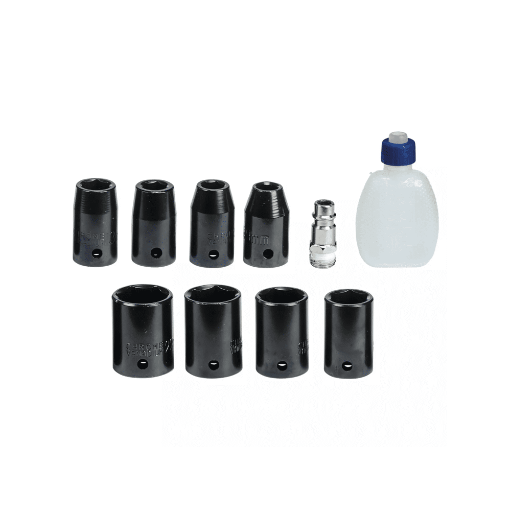 Het product is compleet met 8 kracht in de maten 8/10/11/13/17/19/21/22 millimeter en 1 kleine oliefles en een EURO aansluit nippel.