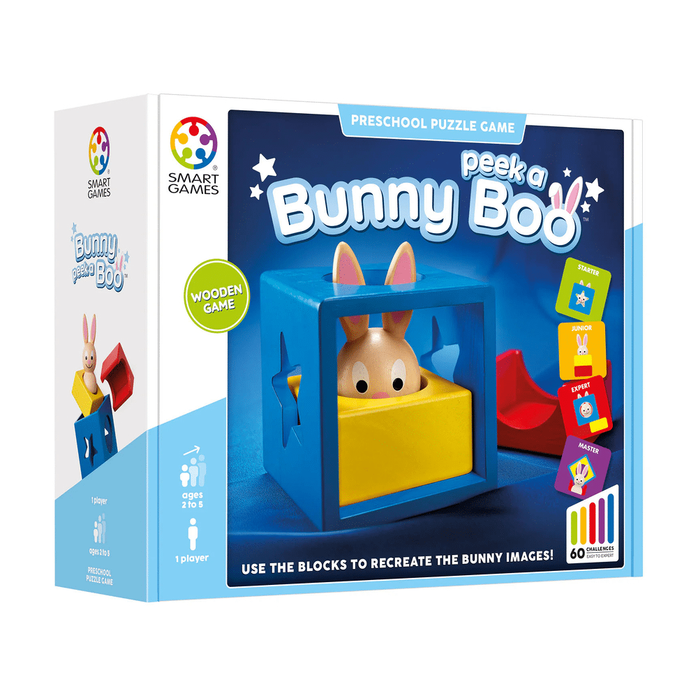 Met Smart Games Peek-a-boo beleef je uren speelplezier terwijl je kind spelenderwijs leert. Deze kleurrijke 3D puzzel met houten blokken en een lief konijntje daagt uit om logisch na te denken en te experimenteren met vormen en posities.