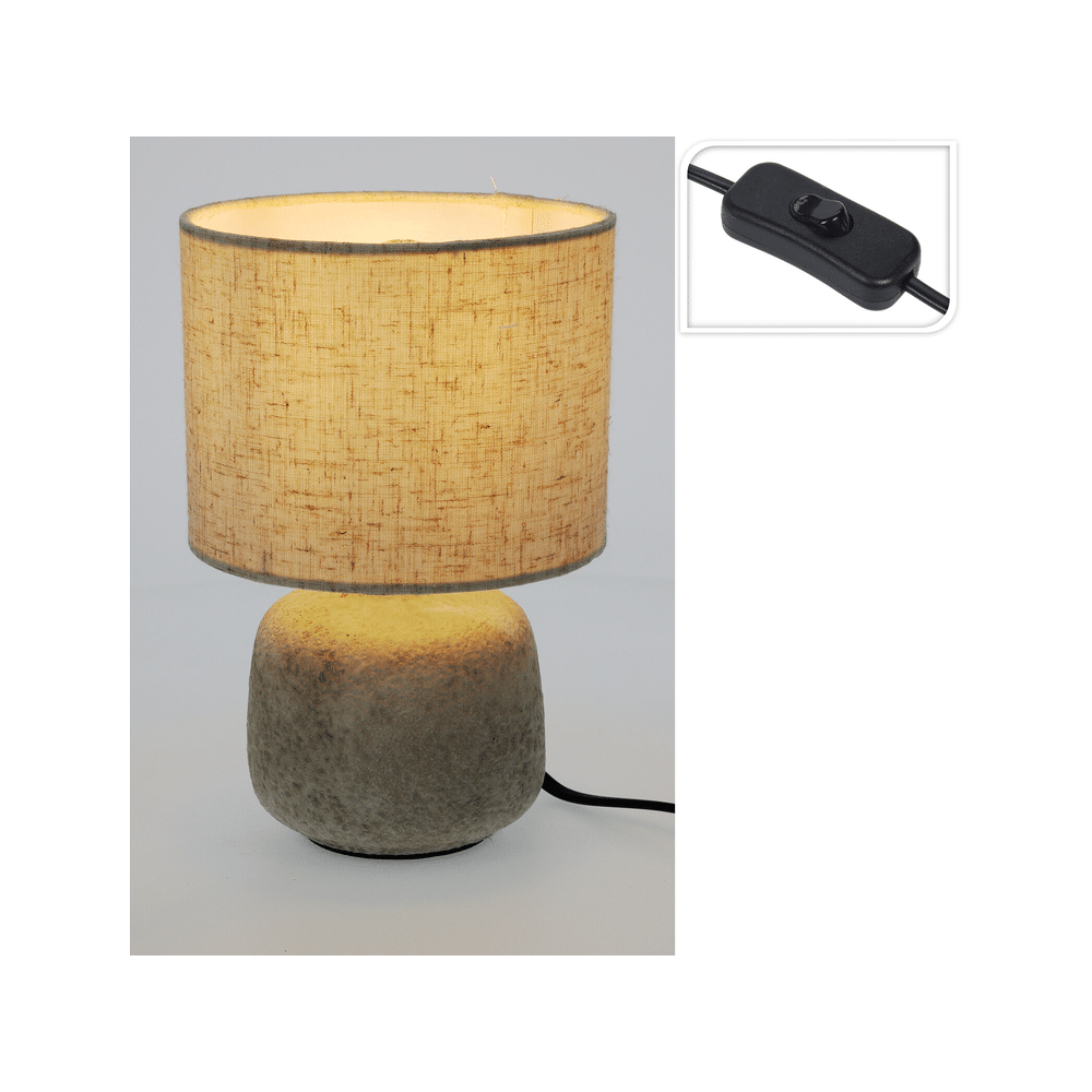 Deze tafellamp straalt eenvoud en charme uit. Het stenen onderstuk geeft een stoere look, terwijl het stoffen kapje voor warm, diffuus licht zorgt. Perfect om te ontspannen of te werken met een gezellige touch.- Compact formaat, past overal