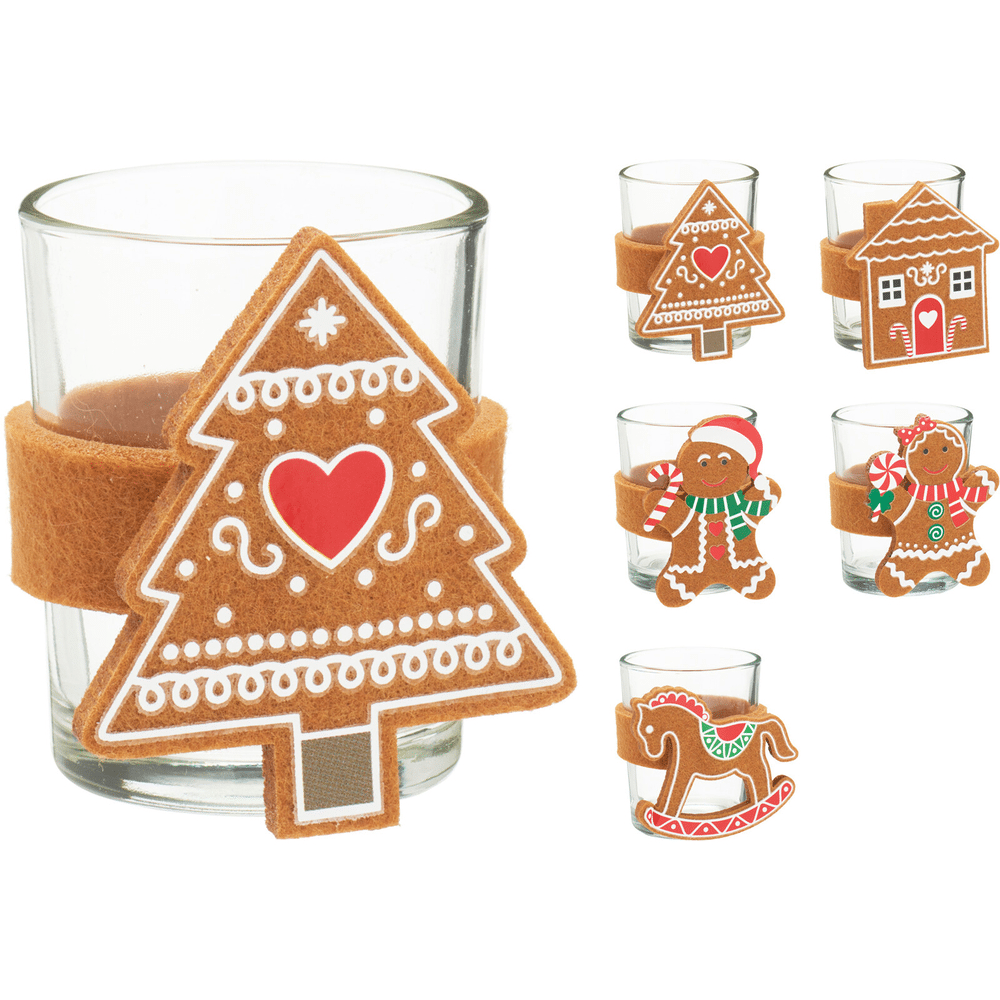 Breng instant kerstsfeer in huis met dit schattige cookie kerstboom windlichtje van 7 cm. Het glazen potje is versierd met een vilten vormpje in koekjesstijl – een gezellige blikvanger in bruin, wit en rood. Perfect om te combineren met de andere windlichtjes uit deze collectie. Mix & match jouw ideale kerstsfeertje!