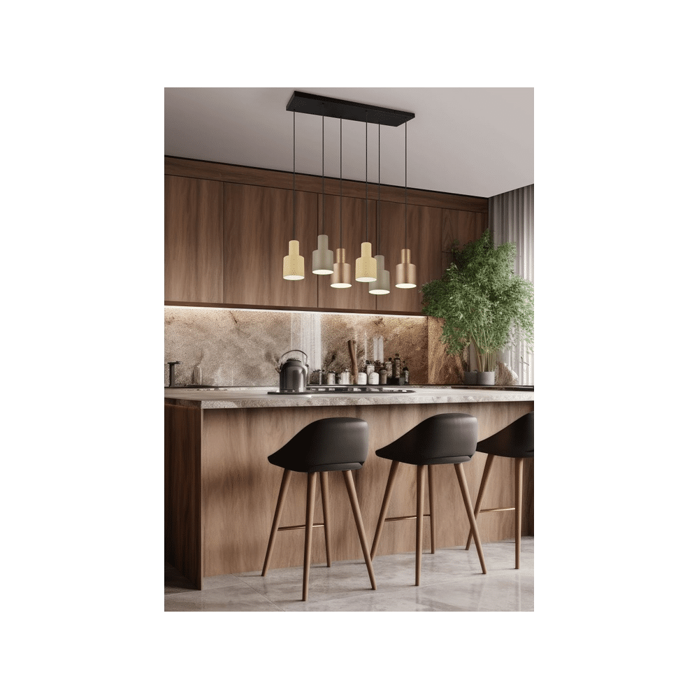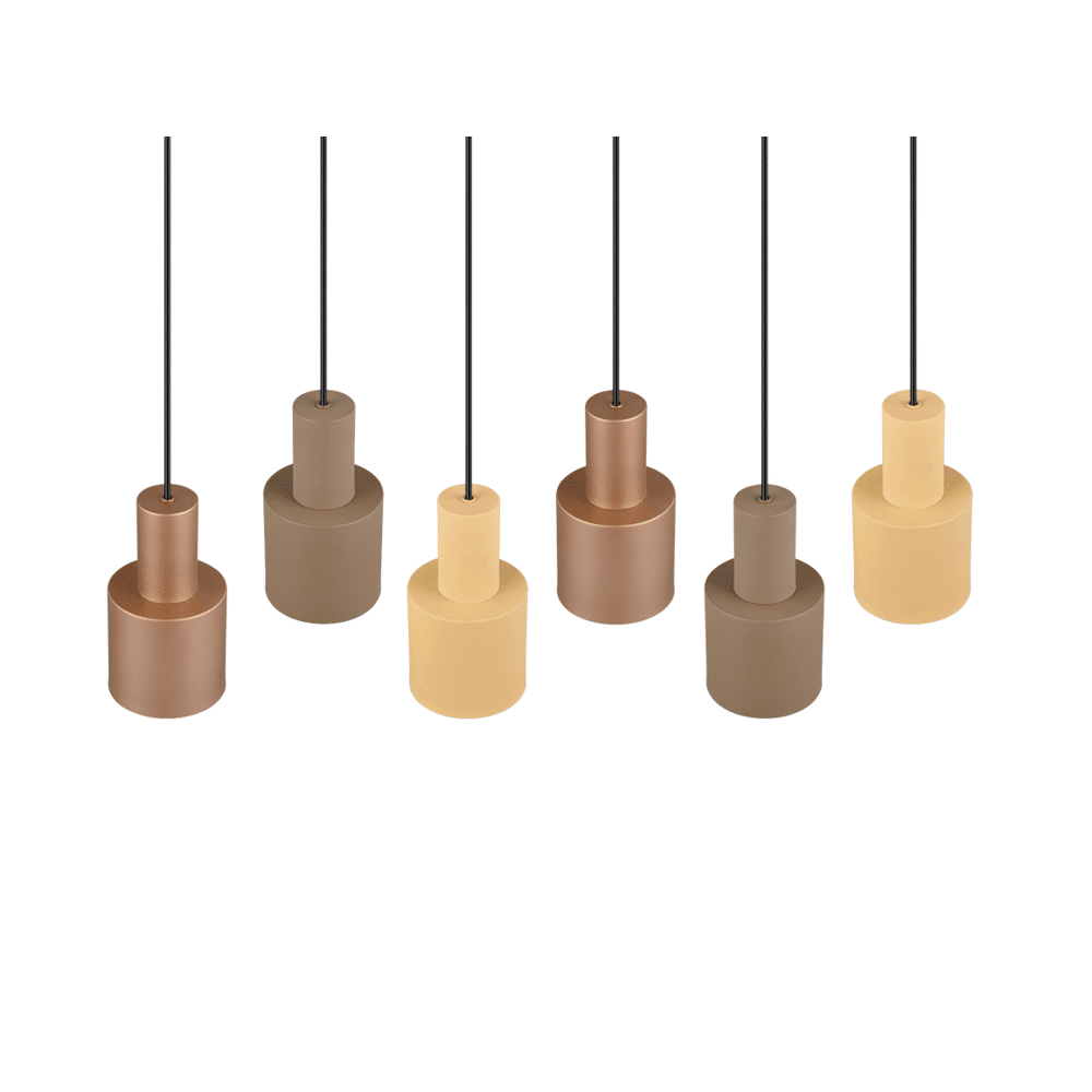 De Trio AGUDO zeslamps hanglamp is een verfijnd designelement voor je interieur. De combinatie van gedempte natuurlijke kleuren en mat zwart zorgt voor een minimalistische uitstraling met een gezellige sfeer. Deze lamp is perfect voor boven een eet- of woonkamertafel en verbetert de algehele ambiance van de ruimte met haar warme, natuurlijke gloed.